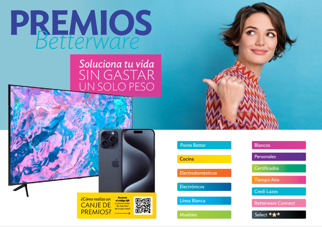 Al afiliarte obtienes puntos betterware en todas tus compra. Los cuales podrás acumular para canjearlos por fabulosos regalos organizados en diversas categorías, tales como cocina, electrdomésticos, línea blanca y más.